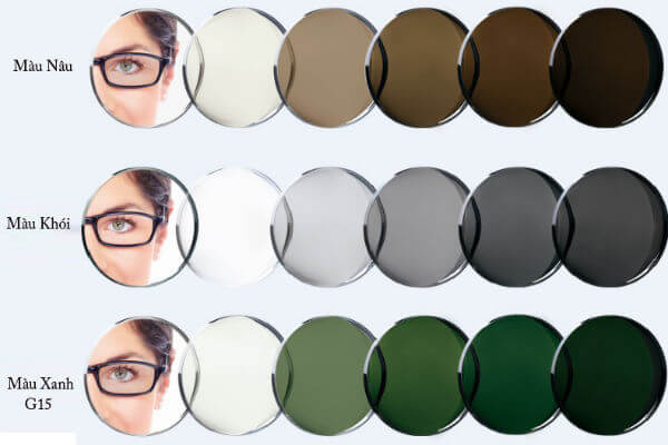 Các màu thông dụng của kính đổi màu là màu khói và nâu trà. Chỉ có tròng cao cấp của Essilor có thêm xanh rêu, xanh sapphire, xanh ngọc bích, màu hổ phách, thạch anh tím.